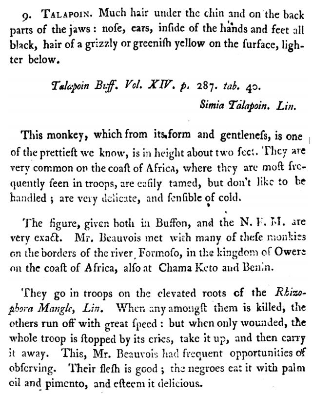 Talapoins are two species of Old World monkeys classified in the genus Miopithecus that live in central Africa, with their range extending from Cameroon and the Democratic Republic of the Congo to Angola, one of which, the Angolan talapoin (Miopithecus talapoin), is pictured here.