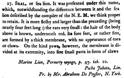 In his Natural History Lecture No. 3 (1799), Academy of Natural Sciences of Drexel University, Peale wrote: "This imperfect preservation of a Sea Lion, by its size bespeaks it to be a young. The Sea Lion, full grown, measures upwards of 16 feet in length. However, it appears that there are two sorts of Sea Lions, one with a mane & much larger than the other kind. They are found near the South Pole. The Historical Journal of Pernetty gives this account. 'The hair that covers the back part of the head, neck and shoulders, is at least as long as the hair of the Goat. It gives this amphibious Animal an air of resemblance to the common Lion of the forest, excepting the difference of size. The Sea Lions of the kind I speak are 25 feet in length, and from 19 to 20 in their greatest circumference. In other respects they resemble the common Sea Lions. Those of the small kind have a head resembling a mastiff, with close cropped ears.' . . . This young Sea Lion differs considerably from the Seal, having no claws before, but only fins, and on the upper side of the hind fins some nails. Therefore on the land this Animal must be more helpless than the common Seal, which has considerable claws."
