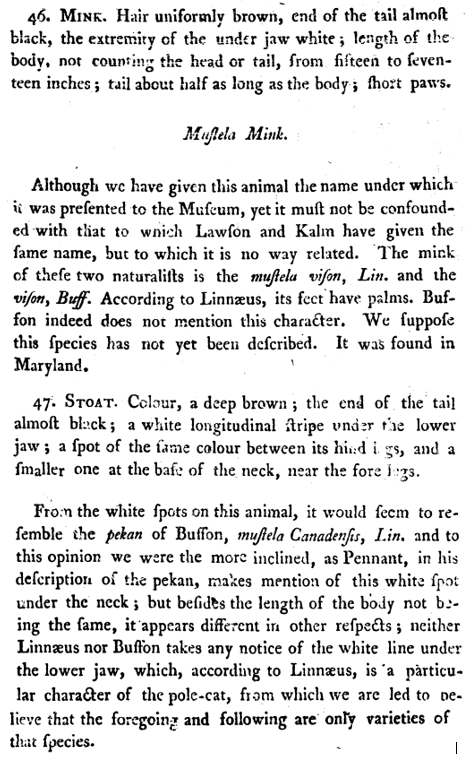 John D. Godman, American Natural History. Part I. Mastology, 3 vols. (Philadelphia, 1826-1828), 1: 208, states that there is "an overstuffed and faded skin of the common mink" in the Philadelphia Museum."