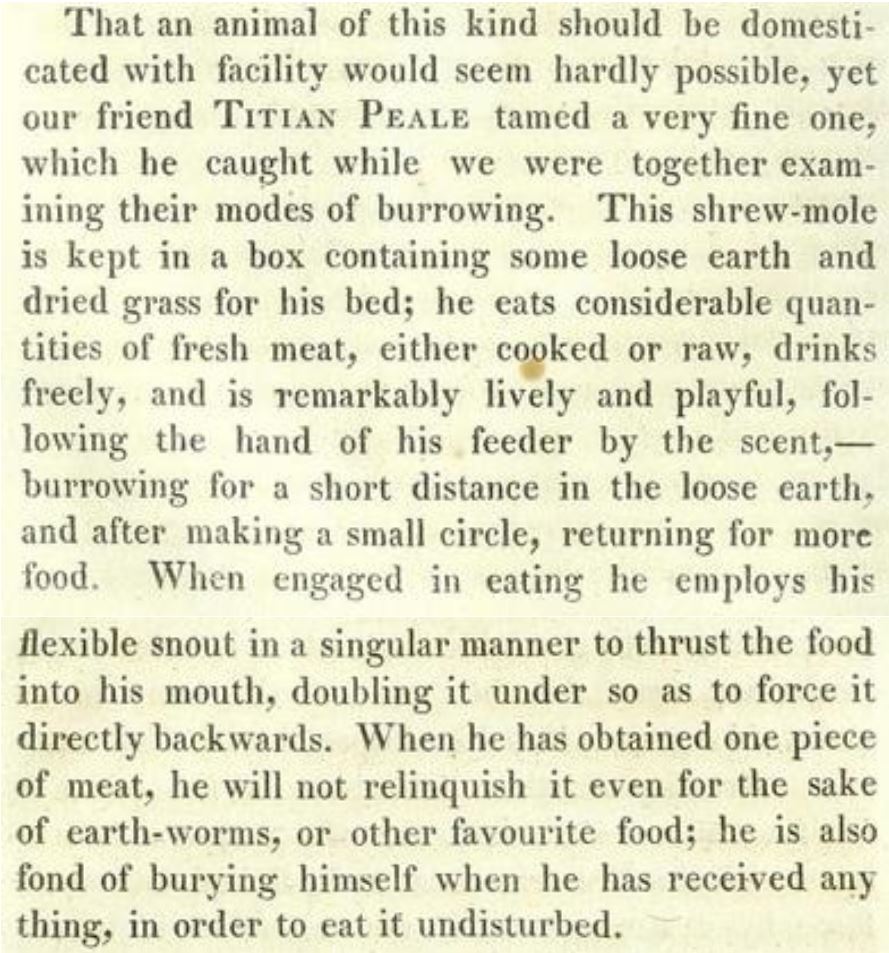 John D. Godman also described what he called the shrew mole in American Natural History. Part I. Mastology, 3 vols. (Philadelphia, 1826-1828), 1: 84-96, where he related information about the live animal kept by Titian Ramsay Peale, whose watercolor is pictured here / https://www.biodiversitylibrary.org/page/49165370