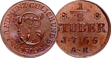 This is a small-denomination copper coin from the old German State of Julich Berg, minted ftrom 1765 to 1794.