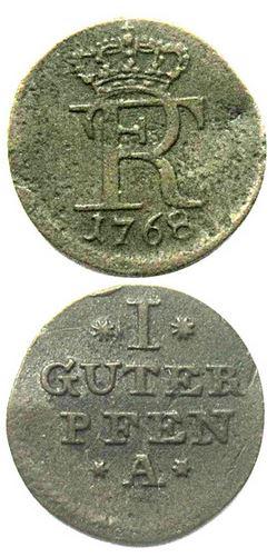 Du Simitière's coin may have been similar to this 1768 1-pfennig coin bearing the arms of Frederick II (the Great), king of Prussia (1712-1786; reigned 1740-1786) and the inscription "guter pfen."