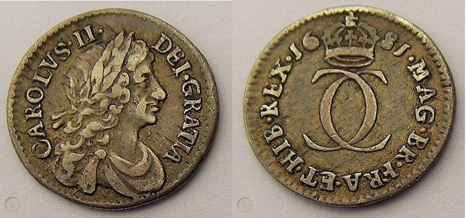 Pictured here is a 1681 Charles II silver maundy twopence. Maundy money is struck in denominations of one penny, two pence, three pence, and four pence. In Britain, following Royal Maundy (a religious service in the Church of England held on Maundy Thursday, the day before Good Friday), the monarch or a royal official ceremonially distributed small silver coins known as "Maundy money" as symbolic alms to elderly recipients. The coins were legal tender but did not circulate because of their silver content and numismatic value.