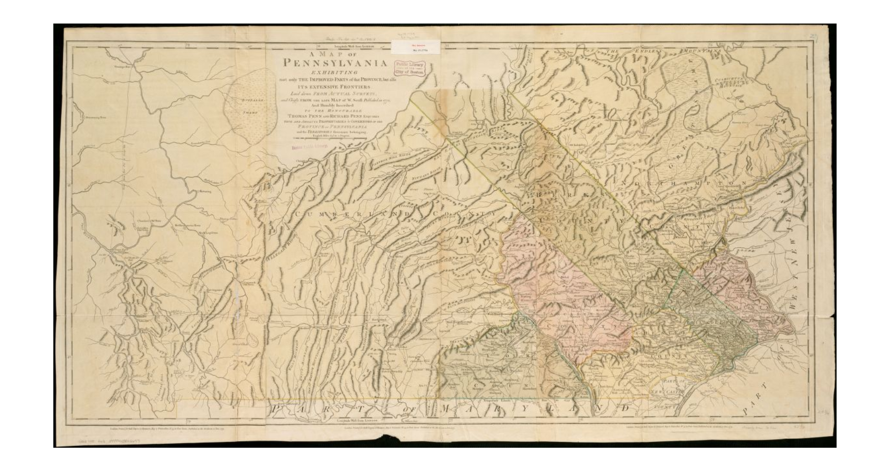 This was either William Scull (1739-1784), To the Honorable Thomas Penn and Richard Penn, Esquires, True and Absolute Proprietaries and Governors of the Province of Pennsylvania and the Territories Thereunto Belonging and to the Honorable John Penn, Esquire, Lieutenant-Governor of the Same, This Map of the Province of Pennsylvania Is Humbly Dedicated (Philadelphia, 1770; about 32 by 22 inches), or Thomas Jefferys' A Map of Pennsylvania Exhibiting Not Only the Improved Parts of That Province, But Also Its Extensive Frontiers: Laid Down from Actual Surveys, and Chiefly from the Late Map of W. Scull Published in 1770; and Humbly Inscribed to the Honorable Thomas Penn and Richard Penn, Esquires, True and Absolute Proprietaries & Governors of the Province of Pennsylvania and the Territories Thereunto Belonging (London, 1775; about 27 by 52 inches), both of which are pictured here.