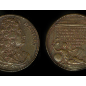 This bronze medal is one of 74 in the Galerie Métallique des Grand Hommes du siècle de Louis XIV (Celebrated Men of the Reign of Louis XIV) by Jean Dassier (1676-1763), Chief Engraver at the Genovese mint, issued in 1723-1724. There are two main types of designs for the reverse – both have a monument and either a reclining figure or two putti. Each medal is 28mm diameter.