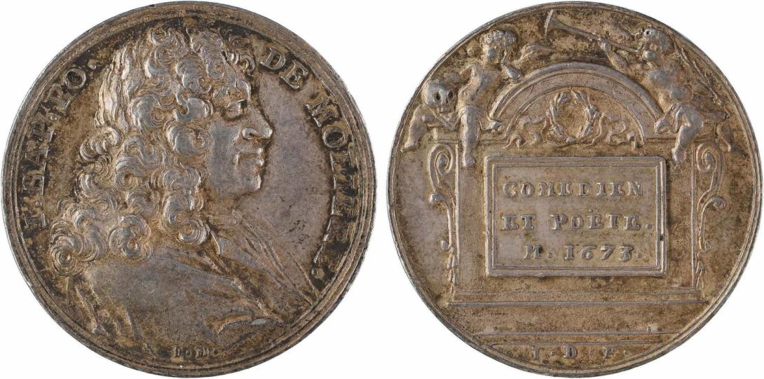 This bronze medal is one of 74 in the Galerie Métallique des Grand Hommes du siècle de Louis XIV (Celebrated Men of the Reign of Louis XIV) by Jean Dassier (1676-1763), Chief Engraver at the Genovese mint, issued in 1723-1724. There are two main types of designs for the reverse – both have a monument and either a reclining figure or two putti. Each medal is 28mm diameter.