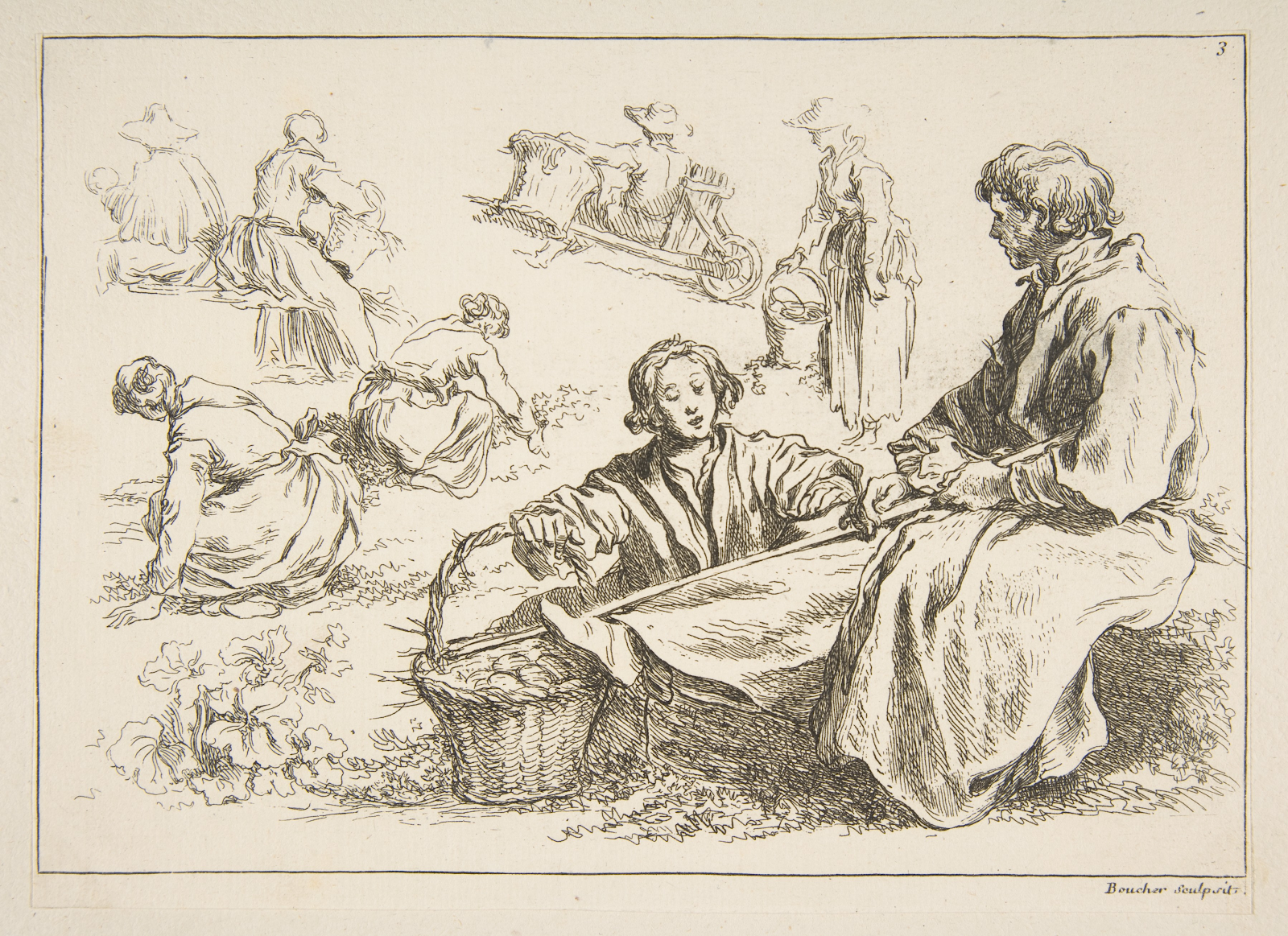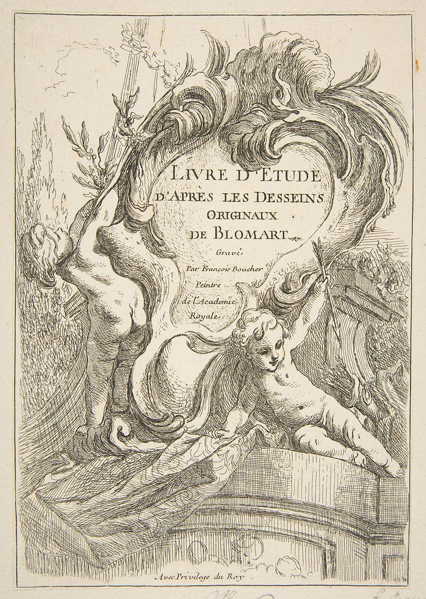 Etchings by François Boucher (1703-1770) after Abraham Blomaert (1566-1651), in Livre d'Etude d'après les Desseins Originaux de Blomaert (ca. 1735). The title page and a representative plate are pictured here.