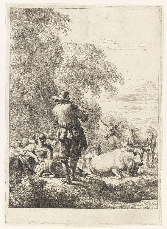 No such print after Philip James de Loutherbourg (1740-1812) has been located; there is a print in aqua fortis by Nicolaes Pietersz Berchem (ca. 1620-1683) depicting a shepherd playing the flute, pictured here, that is now in the Louvre.