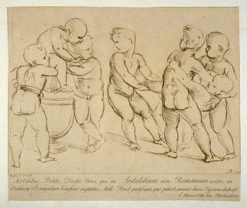 Etching printed in brown ink by Arthur Pond (1701-1758), after Raphael, "Six Playing Putti," from the series "Prints in Imitation of Drawings" (1735)