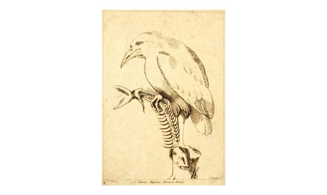 Etching printed in brown ink by Charles Knapton (ca. 1700-1760), after Giovanni da Udine (1487-1564), A bird perching on a stump with a fish skeleton in his claw, from the series "Prints in Imitation of Drawings" (1735)
