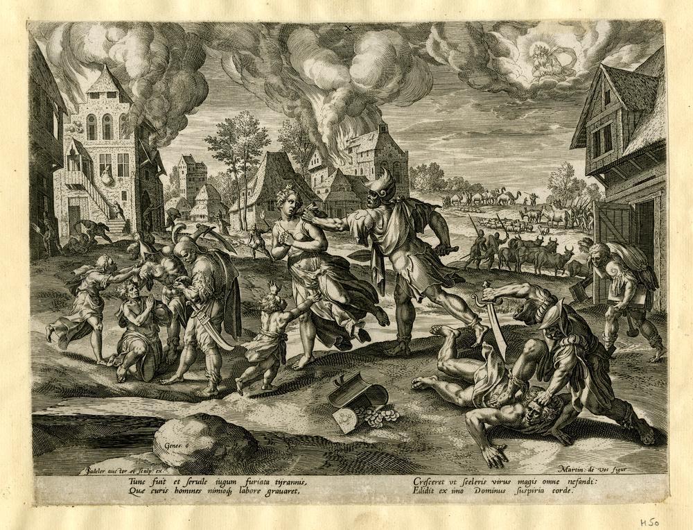 Engraving by Jan Sadeler (1550-1600), after Maarten de Vos (1532-1603), Wickedness and violence on earth (Genesis 6:5-7) (Flemish, 1586)