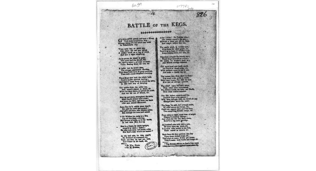 The Battle of the Kegs is a propaganda ballad written by Francis Hopkinson describing an attempted (but ineffectual) attack upon the British fleet in the harbor of Philadelphia on 6 Jan 1778 during the American Revolution. Kegs filled with gunpowder were used as floating mines, but they failed to detonate. See https://www.americanantiquarian.org/thomasballads/items/show/127