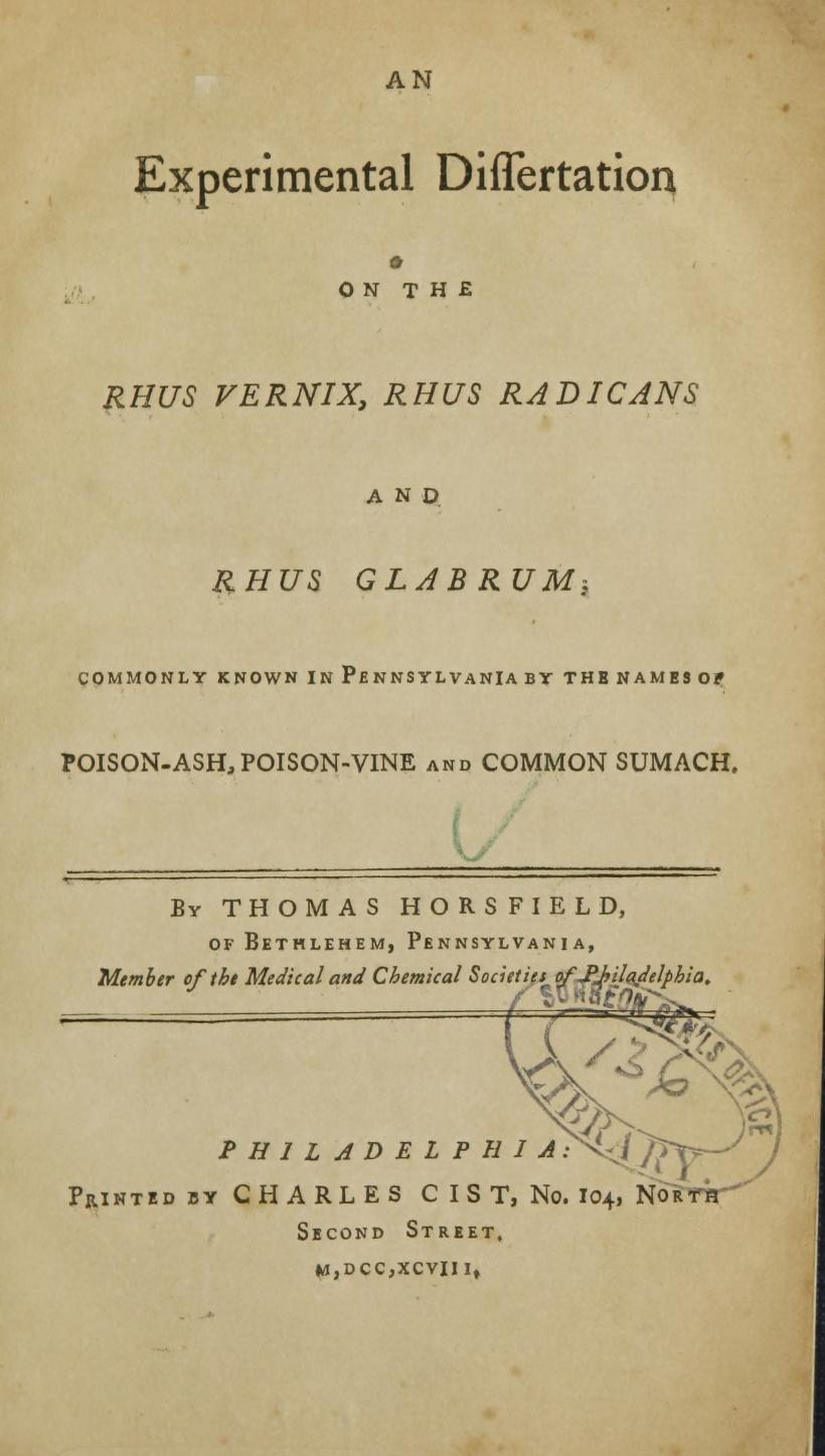 An experimental dissertation on the rhus vernix, rhus radicans and rhus glabrum: commonly known in Pennsylvania by the names of poison-ash, poison-vine and common sumach