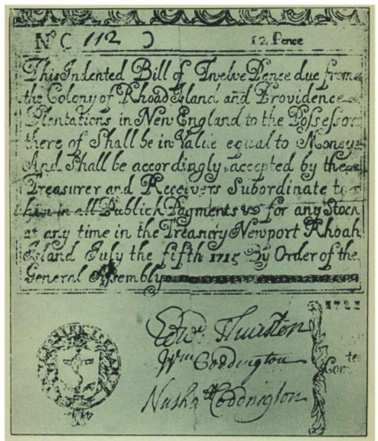 In 1715 Rhode Island issued £40,000, occasioned by costs of expeditions against the Canadians and contributiing to inflation. George L. McKay, "Early American Currency" / http://numismatics.org/digitallibrary/ark:/53695/nnan122578
