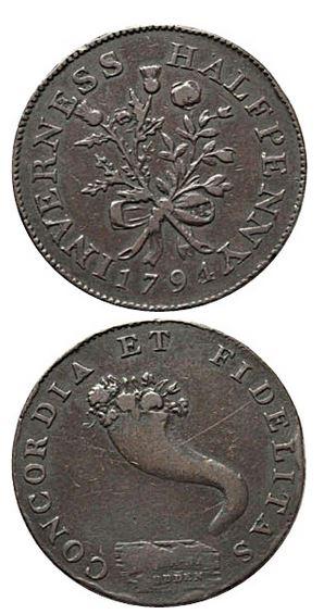This may have been an Inverness Conder token (halfpenny). An example of 1794 is pictured here. Conder tokens, also known as 18th-century provincial tokens, were a form of privately minted token coinage struck and used during the latter part of the 18th century and the early part of the 19th century in England, Anglesey and Wales, Scotland, and Ireland. They were the size, composition, and weight of English halfpence coppers. They were first cataloged by James Conder in 1798, but a more recent reference is Richard Dalton and Samuel H. Hamer, The Provincial Token-Coinage of the 18th Century (1910-1917).