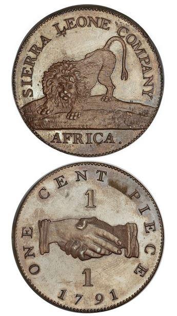 Pictured here is 1791 1-cent piece of the Sierra Leone Company.