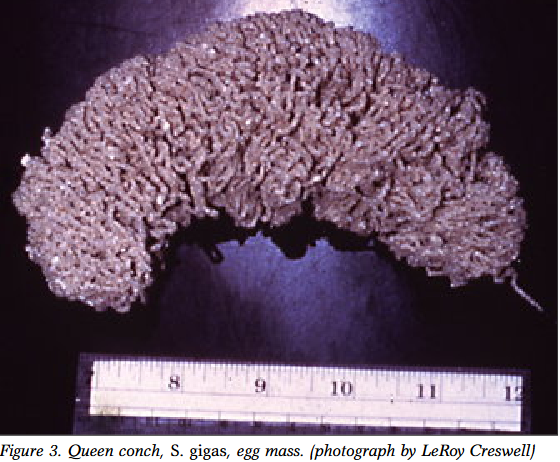 After mating, the female conch lays long gelatinous strings (up to 75 feet). These strings mix with the surrounding sand to form compact egg masses, which may have been fertilized by several males and may contain hundreds of thousands of eggs, which hatch after about 5 days. Lavae then spend about 18-40 days floating and feeding on plankton before settling to the bottom and metamorphosing into the adult form. Lamar University Department of Biology / https://www.lamar.edu/arts-sciences/biology/study-abroad-belize/marine-…