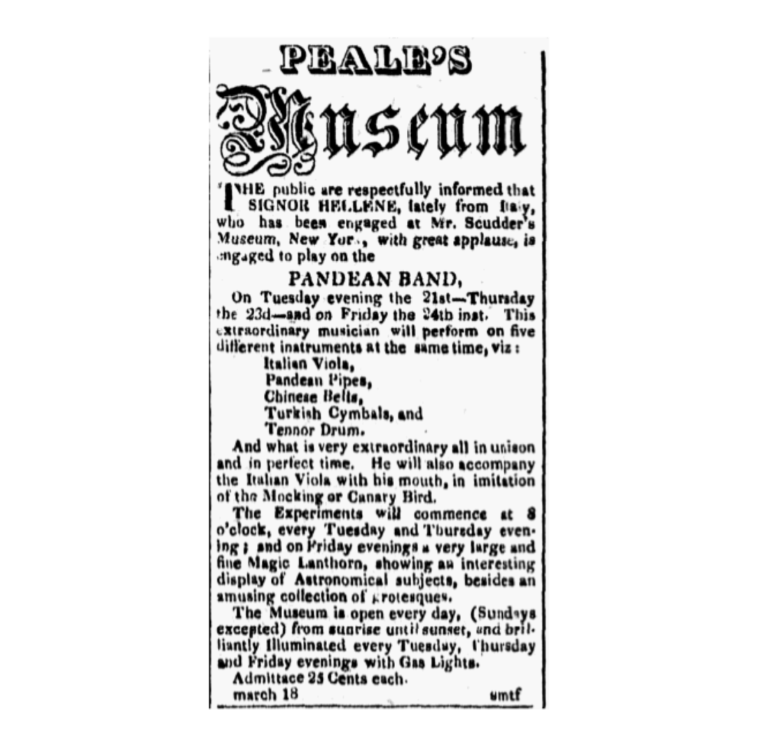"In 1820, the 'Pandean Band,' consisting of a single performer, an Italian named Signor Helene, who played on five different instruments at the same time, was engaged. He was certainly a living curiosity, if not a 'natural' one, for by using his hands, elbows, and knees, he managed to play on the Italian viola, the Turkish cymbals, and the tenor drum, while he blew into a set of pandean pipes thrust into his waistcoat, and by wagging his head tinkled the Chinese bells fixed thereon as a sort of helmet, presenting a grotesque rather than artistic appearance. The 'orchestra-man' has long ceased to be a curiosity, but at that time he drew well." J. Thomas Scharf and Thompson Westcott, History of Philadelphia, 1609-1884, 3 vols. (Philadelphia, 1884), 2: 947