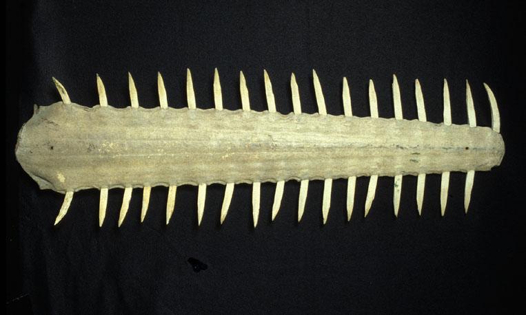 The Peale Museum received five other sawfish beaks, as follows: on 6 June 1812 from Franklin Buchanan, Mar[iner?[; on 15 Apr 1814 from Miss Maryan Dillingham ( a beak 32 inches long); on 15 Oct 1819 from Willaim Maginless; on 17 May 1820 from H. P. Pryce; and on 10 July 1823 from J[oseph] B. Wharton (a beak from Alvarado, Colombis). Accessions Book, pp. 61, 72, 100, 101, and 124