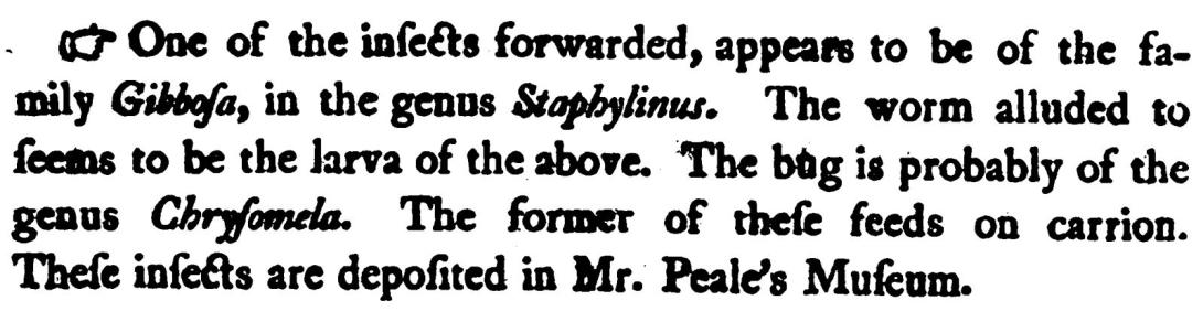 This report by Dr. Clement Sanford (d. 1832), who was "of Wicomico Lower Ferry, Somerset County, Maryland," was dated 26 November 1805 and relates his treatment of a woman who vomited the various worms and bugs he sent to John Redman Coxe (1773-1864). At the end of the published account Coxe added a note that "These bugs are deposited in Mr. Peale's Museum"; the acquisition is recorded in the Accessions Book, pp. 13-14.