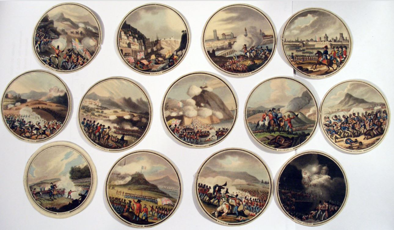 This item is actually thirteen two-sided roundels housed within a double-sided bronze medallion: Edward Orme, "The Battles of the British Army in Portugal, Spain and France from the Year 1808-1814. Under the command of Englands Great Captain Arthur Duke of Wellington, Edited published and sold by Edwd. Orme Bond Street London 1815." The bronze medal depicts a bust of the Duke of Wellington in relief on the obverse, and winged victory on the reverse. It contains thirteen circular coloured engravings of the battles with printed descriptions on each reverse, 3 inches (7.5cm) diameter. See Julie L. Mellby, "Orme's Picture Medal" / https://www.princeton.edu/~graphicarts/2012/11/ormes_battles_of_the_bri…