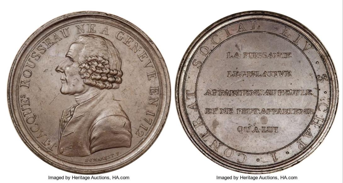 Token coin depicting Jean-Jacques Rousseau (1712-1778), 1792, engraved by Rambert Dumarest (1760-1806), struck at the Soho Mint, Birmingham, England.