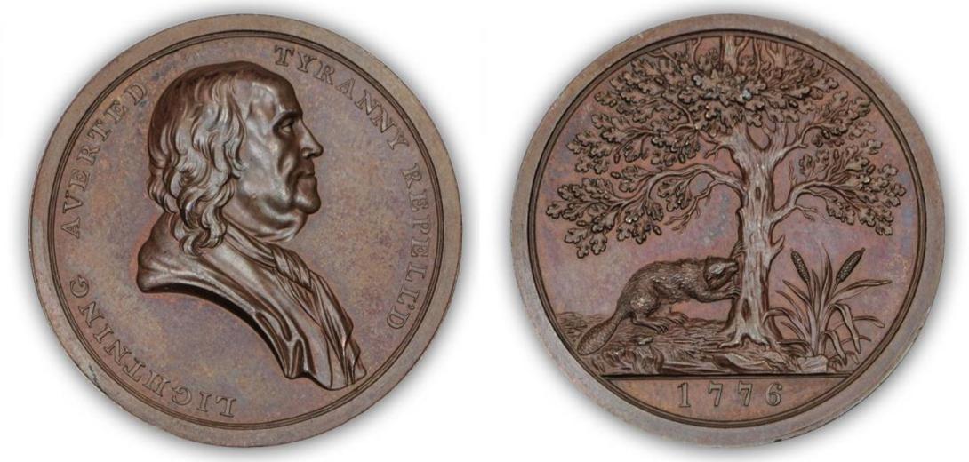 Ca. 1807 medal engraved by John Reich (C. Wyllys Betts-546; R.W. Julian-CM-8). "This medal was first struck at the US Mint in 1807 as part of Philadelphia merchant Joseph Sansom's planned "Medallic History of the American Revolution" series. Only four were ever struck: the very rare Washington C.C.A.U.S. medal, the Washington Presidency Reliquished medal, the 1783 Treaty of Paris medal with jugate busts of Washington and Franklin on the obverse and an eagle above a map of the United States on the reverse, and this medal, depicting Franklin and the American beaver felling the British oak in 1776" / https://www.jkamericana.com/joseph-sansom-s-benjamin-franklin-american-…