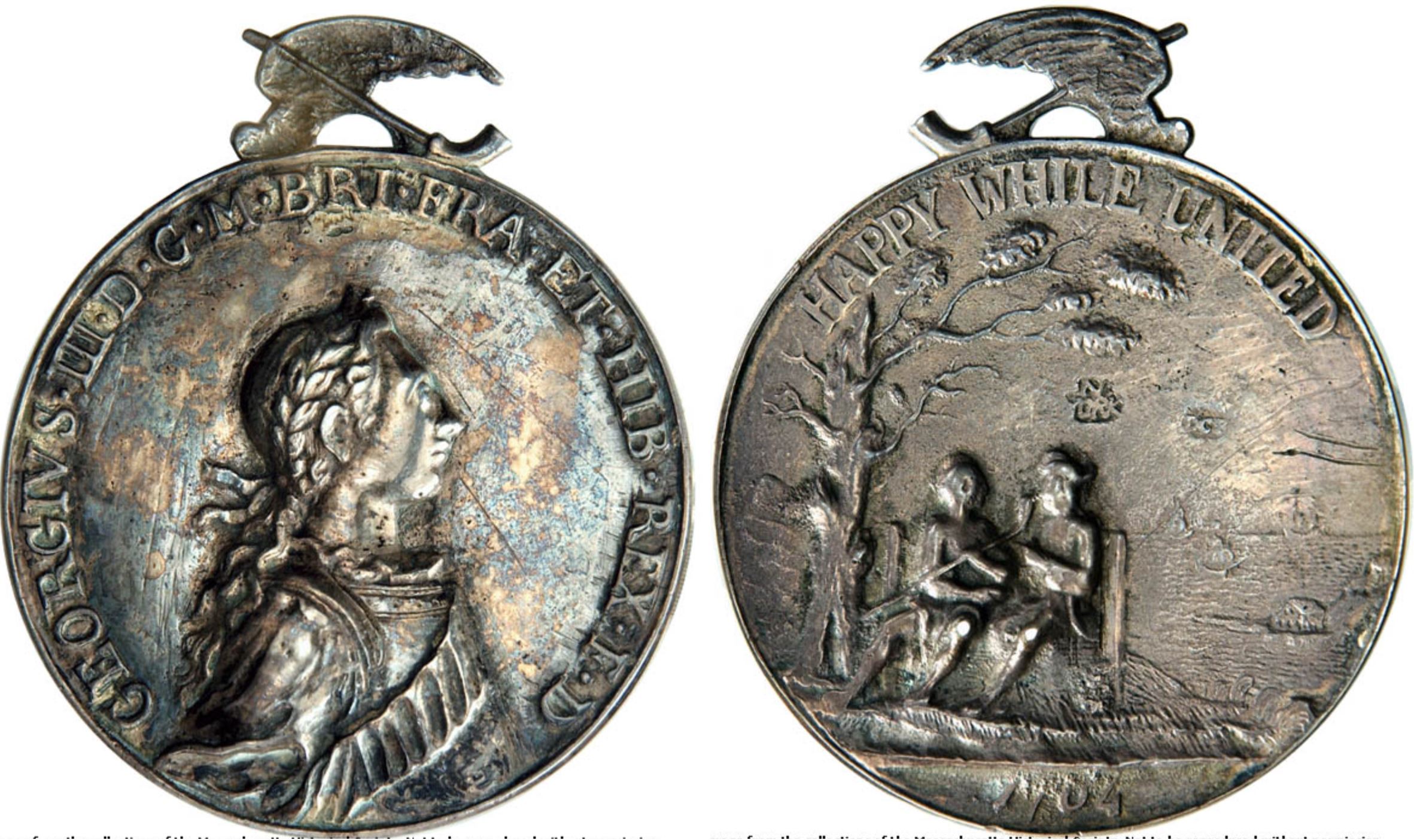 After the Seven Years' War ended in 1763, Native American leaders in the Great Lakes area began asking the British to replace their now obsolete French flags, certificates, and medals. To meet demand, early “Happy While United” medals were made in New York City and widely distributed. See Joseph A. Mussulman and Kristopher K. Townsend, "Peace Medals: Tools of diplomacy and trade" at https://lewis-clark.org/trail-diplomacy/peace-medals/
