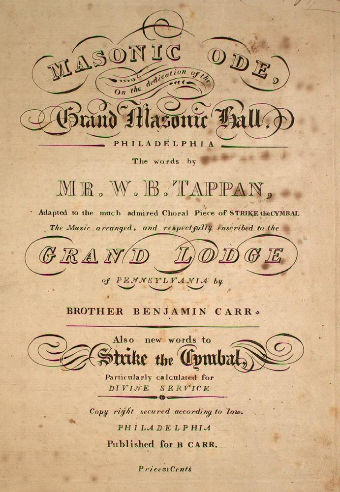Masonic Ode, on the dedication of the Grand Masonic Hall, Philadelphia. Also new words to Strike the Cymbal, Particularly calculated for Divine Service, The words by Mr. W.B. Tappan, Adapted to the much admired Choral Piece of Strike the Cymbal. The Music arranged, by Brother Benjamin Carr (Philadelphia, 1820)