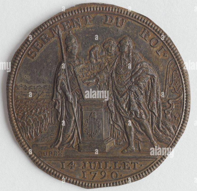 Token coin, 1792, depicting King Louis XVI taking the oath on 14 July 1790, engraved by Augustin Dupré (1748-1833), struck at the Soho Mint, Birmingham, England.