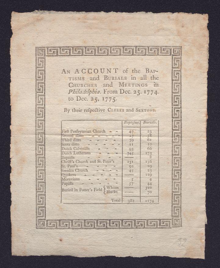 An Account of the baptisms and burials in all the churches and meetings in Philadelphia: From Dec. 25, 1774 to Dec. 25, 1775. /By their respective clerks and sextons