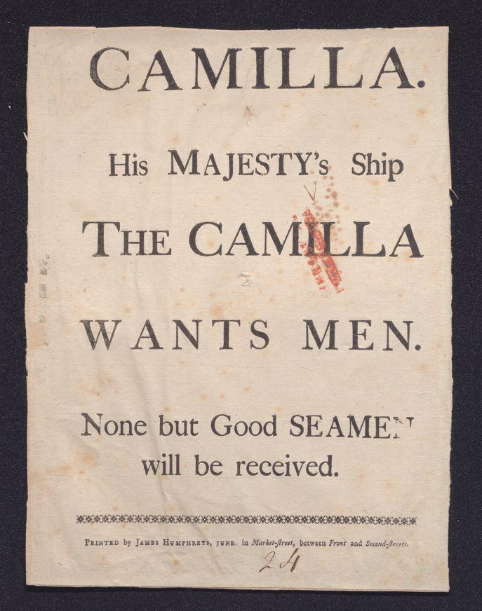 Camilla. His Majesty's ship the Camilla wants men. None but good seamen will be received.