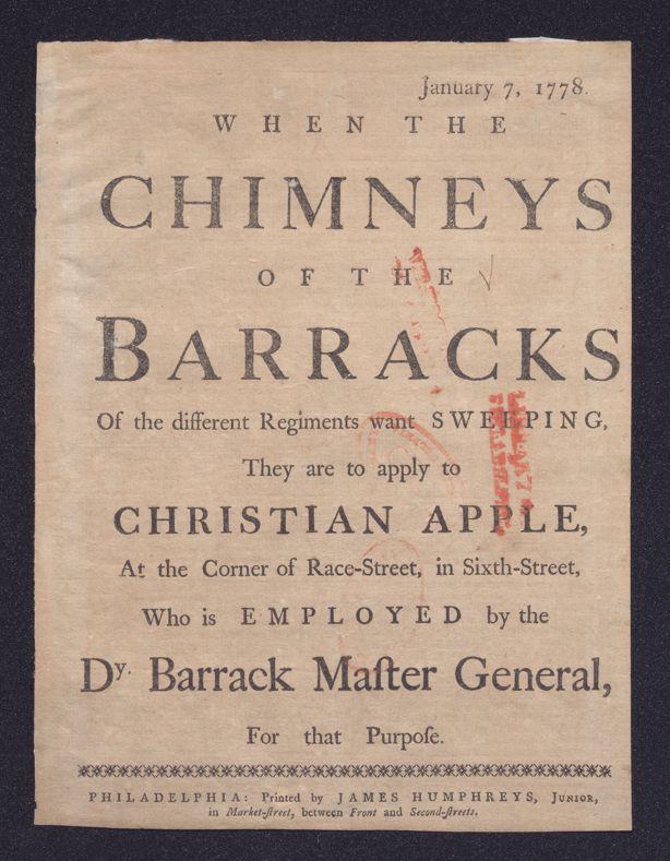 January 7, 1778. When the chimneys of the barracks of the different regiments want sweeping, they are to apply to Christian Apple, at the corner of Race-Street, in Sixth-Street, who is employed by the dy. barrack master general for that purpose