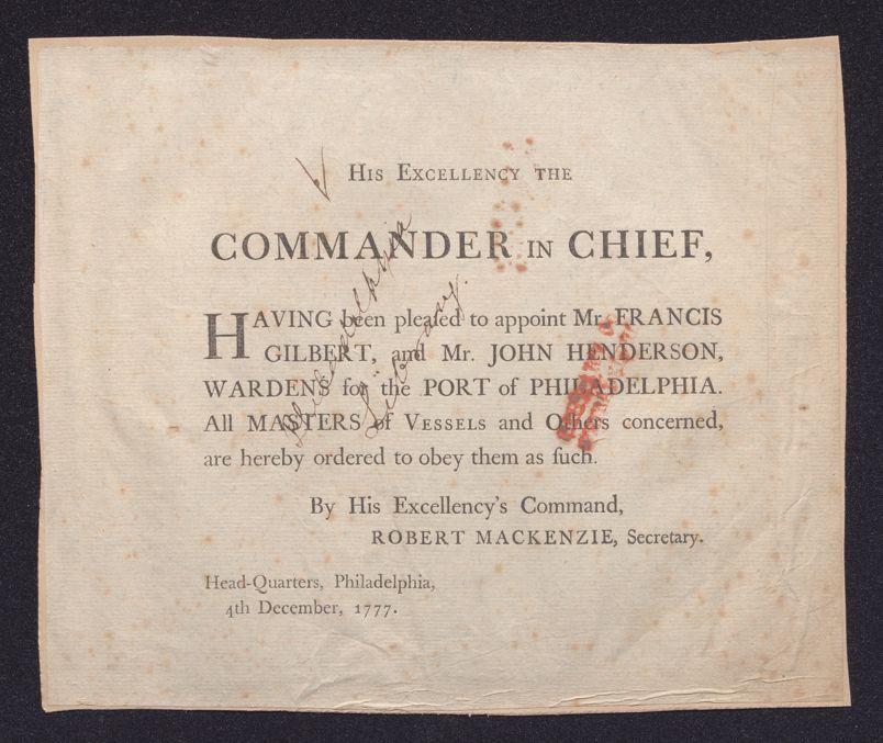 His Excellency the commander in chief, having been pleased to appoint Mr. Francis Gilbert, and Mr. John Henderson, wardens at the port of Philadelphia: All masters of vessels and others concerned, are hereby ordered to obey them as such. /By His Excellency's command, Robert Mackenzie, secretary. Head-quarters, Philadelphia, 4th December, 1777