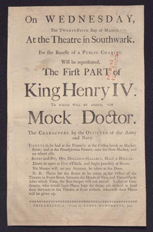 On Wednesday, the twenty-fifth day of March, at the theatre in Southwark, for the benefit of a public charity, will be represented, the first part of King Henry IV. To which will be added, The mock doctor. The characters by the officers of the Army and Navy. ..