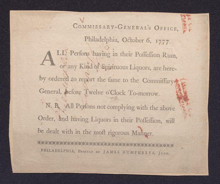 Commissary-General's Office, Philadelphia, October 6, 1777: All persons having in their possession rum, or any kind of spirituous liquors, are hereby ordered to report the same to the commissary-general before twelve o'clock to-morrow. N.B. All persons not complying with the above order, and having liquors in their possession, with be dealt with in the most rigorous manner