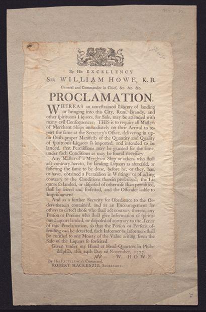 By His Excellency Sir William Howe, K.B. general and commander in chief, &c.&c.&c. Proclamation: Whereas an unrestrained liberty of landing or bringing into this city, rum, brandy, and other spirituous liquors, for sale, may be attended with many evil consequences ... /Give under my hand at head-quarters in Philadelphia, this 24th day of November, 1777. W. Howe. By his excellency's command, Robert Mackenzie, secretary