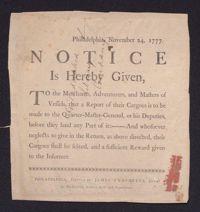 Philadelphia, November 24, 1777: Notice is hereby given, to the merchants, adventurers, and masters of vessels, that a report of their cargoes is to be made to the quarter-master-general, or his deputies, before they land any part of it: -------An whosoever neglects to give in the return, as above directed, their cargoes shall be seized, and a sufficient reward given to the informer