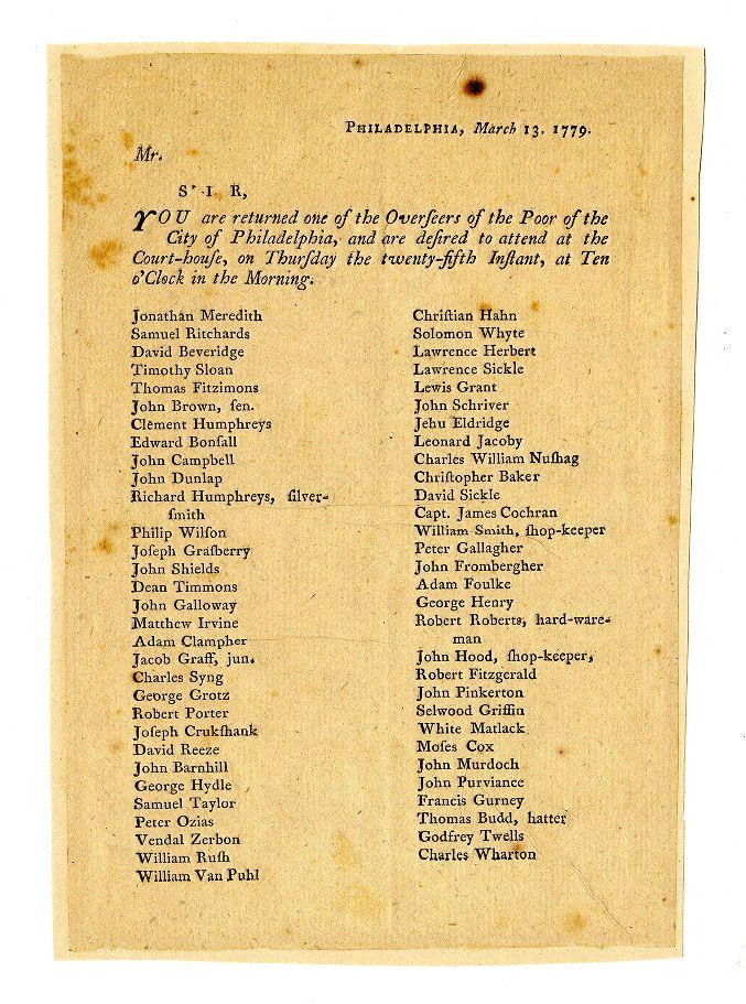Philadelphia, March 13. 1779: Mr. [blank] Sir, You are returned one of the Overseers of the Poor of the city of Philadelphia, and are desired to attend at the court-house, on Thursday the twenty-fifth instant, at ten o'clock in the morning. ...