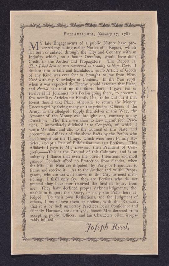 Philadelphia, January 27, 1781: My late engagements of a public nature have prevented my taking earlier notice of a report, which has been circulated through the city and country with an industry which, on a better occasion, would have done credit to the author and propagators. The report is, that I had been or was concerned in trading to New-York. I declare it to be false and scandalous, ...