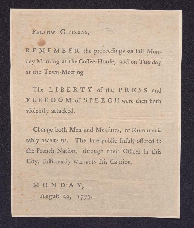 Fellow citizens, Remember the proceedings on last Monday morning at the coffee-house, and on Tuesday at the town-meeting: The liberty of the press and freedom of speech were then both violently attacked. Change both men and measures, or ruin inevitably awaits us. The late public iinsult offered to the French nation, through their officer in this city, sufficiently warrants this caution. Monday, August 2d, 1779.