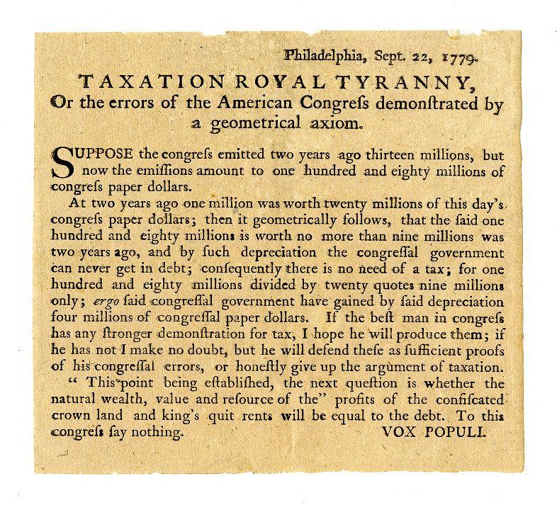 Philadelphia, Sept. 22, 1779: Taxation royal tyranny, or The errors of the American Congress demonstrated by a geometrical axiom. ..