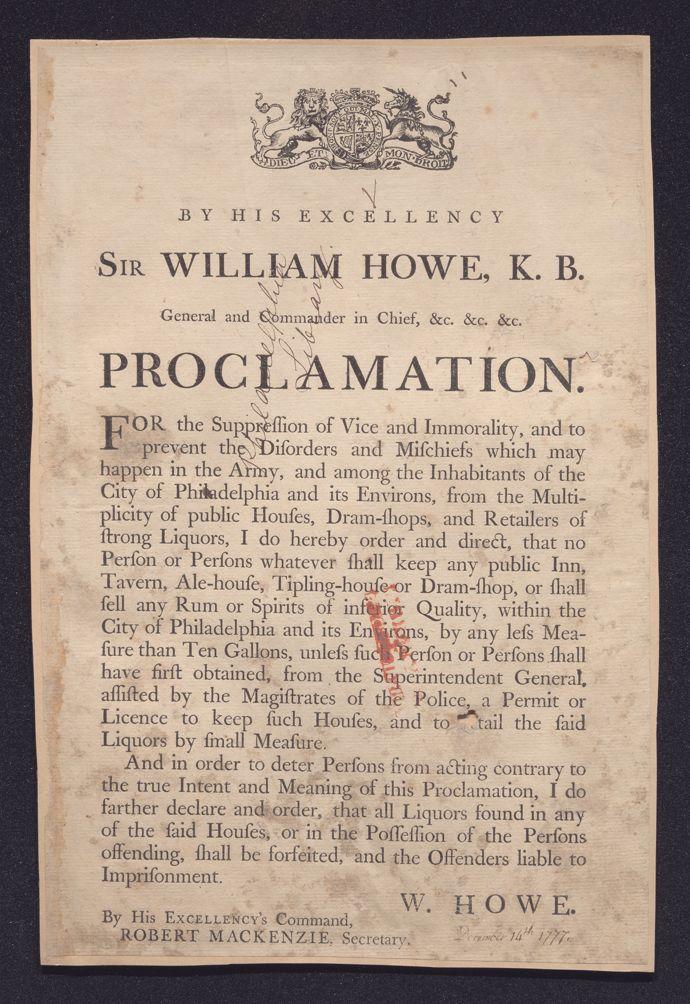 By His Excellency Sir William Howe, K.B. general and commander in chief &c. &c. &c. Proclamation: For the suppression of vice and immorality, and to prevent the disorders and mischiefs which may happen in the army, and among the inhabitants of the city of Philadelphia and its environs, from the multiplicity of public houses, dram-shops, and retailers of stong liquros, I do hereby order and direct, that no person or persons whatever shall keep any public inn, tavern, ale-house, tipling-house or dram-shop, or sell any rum or spirits ... unless such person shall have first obtained ... a permit or licence ...