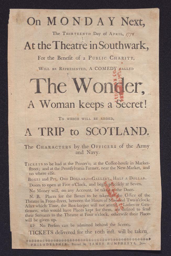 On Monday next, the thirteenth day of April, at the theatre in Southwark, for the benefit of a public charity, will be represented, a comedy called The wonder, a woman keeps a secret! To which will be added, A trip to Scotland. The characters by the officers of the Army and Navy. ...