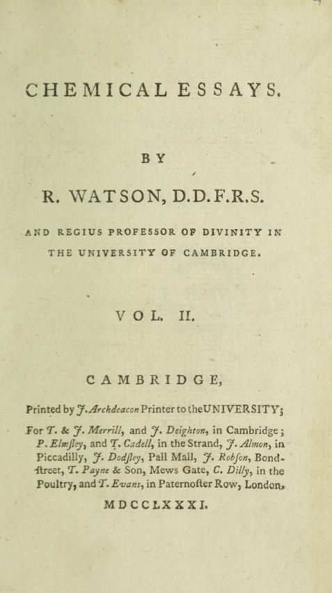 Richard Watson (1737-1816), Chemical Essays, 5 vols. (London and Cambridge, 1781-87)