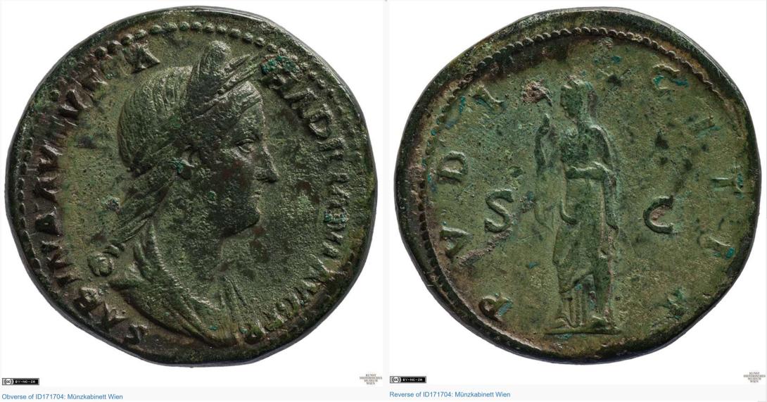 This sestertius minted in Rome may have been similar to the one pictured here: Obverse: SABINA AVGVSTA HADRIANI AVG P P (the empress Sabina, of the emperor Hadrian, Pontifex Maximus): Bust of Sabina, wreathed with possible wheat wreath, wearing stephane with hair in bun, draped, right; Reverse: PVDICITIA (Chastity): Pudicitia, standing left, raising one hand. R.A. Abdy and P.F. Mittag The Roman Imperial Coinage, vol. 2, part 3, Hadrian, 2536-2537