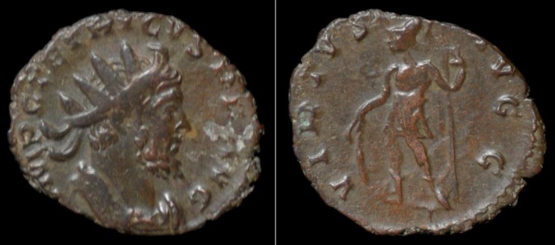 This coin, probably minted in Rome, may have been similar to the one pictured here: Tetricus I AE Antoninianus. Obverse: IMP C TETRICVS P F AVG (successful general Gaius Tetricius pius, felix, emperor), radiate draped bust right; Reverse: VIRTVS AVGG (the Virtue of the two emperors), Virtus standing left with shield & spear. H. Mattingly and E. Sydenham The Roman Imperial Coinage, vol. 5 pt. 2, Tetricius I,148