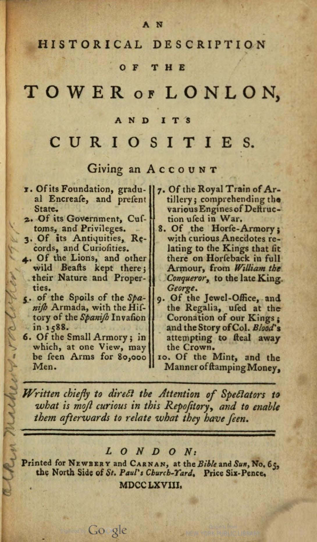 An historical description of the Tower of London, and Its Curiosities was the first of three parts comprising An Historical Account of the Curiosities of London And Westminster (London, 1769).
