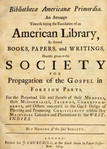 Bibliothecae Americanae primordia: An attempt towards laying the foundation of an American library, in several books, papers, and writings, humbly given to the Society for the propagation of the Gospel in foreign parts, for the perpetual use and benefit of their members, their missionaries, friends, correspondents, and others concern'd in the good design of planting and promoting Christianity within Her Majesties colonies and plantations in the West-Indies