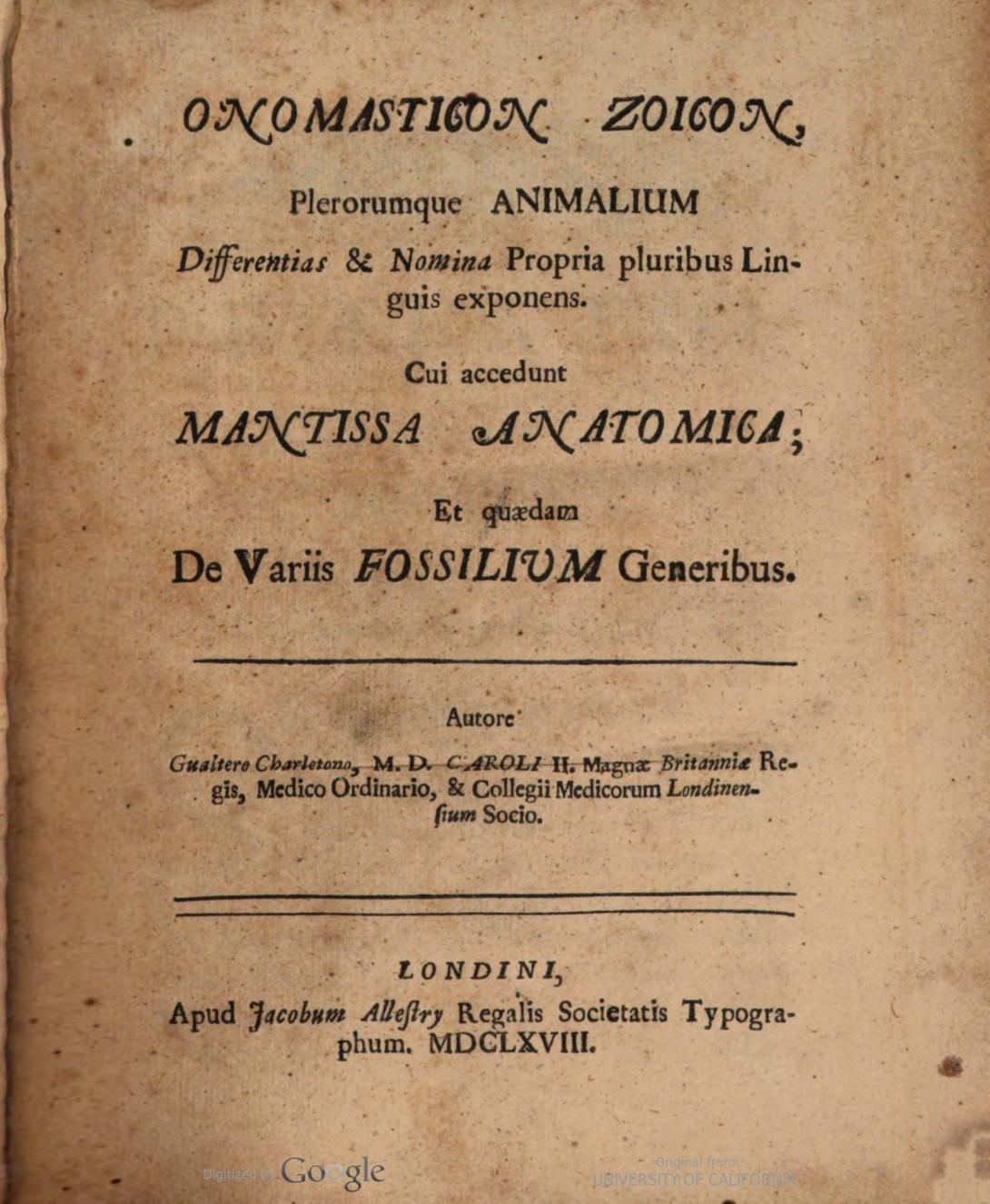 Onomasticon zoicon, plerorumque animalium differentias & nomina propria pluribus linguis exponens : cui accedunt mantissa anatomica, et quædam de variis fossilium generibus